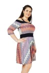 Découvrez cette superbe robe courte aux motifs chevrons multicolores, mêlant harmonieusement les tons corail, blanc et bleu marine. Le design raffiné présente un col bateau noir contrastant et des manches 3/4 bouffantes qui apportent une touche d'élégance supplémentaire. La ceinture noire souligne parfaitement la taille, tandis que la jupe évasée crée une silhouette gracieuse et flatteuse.