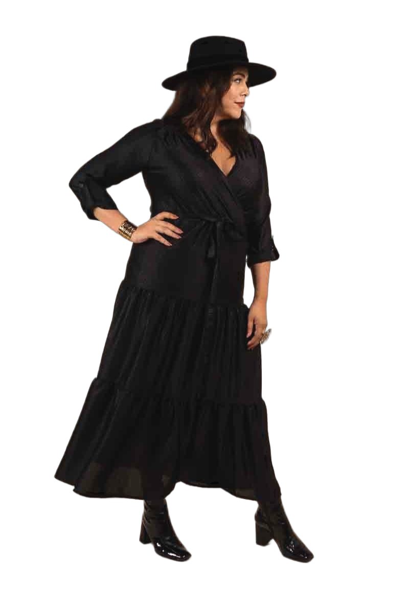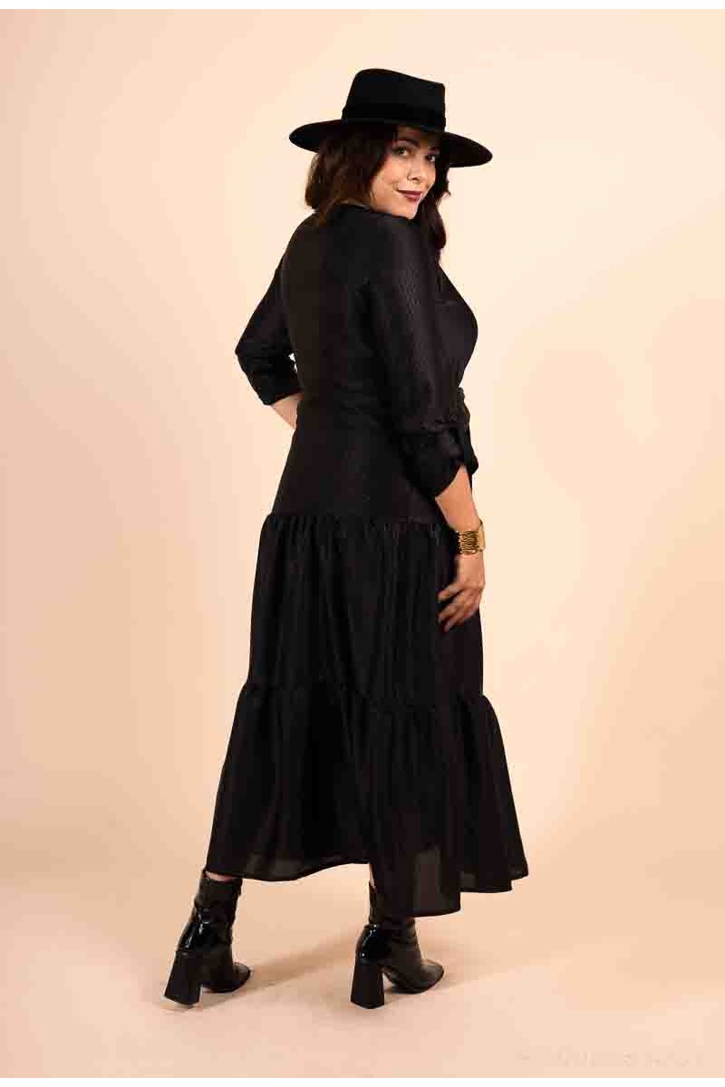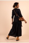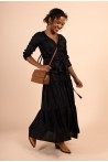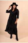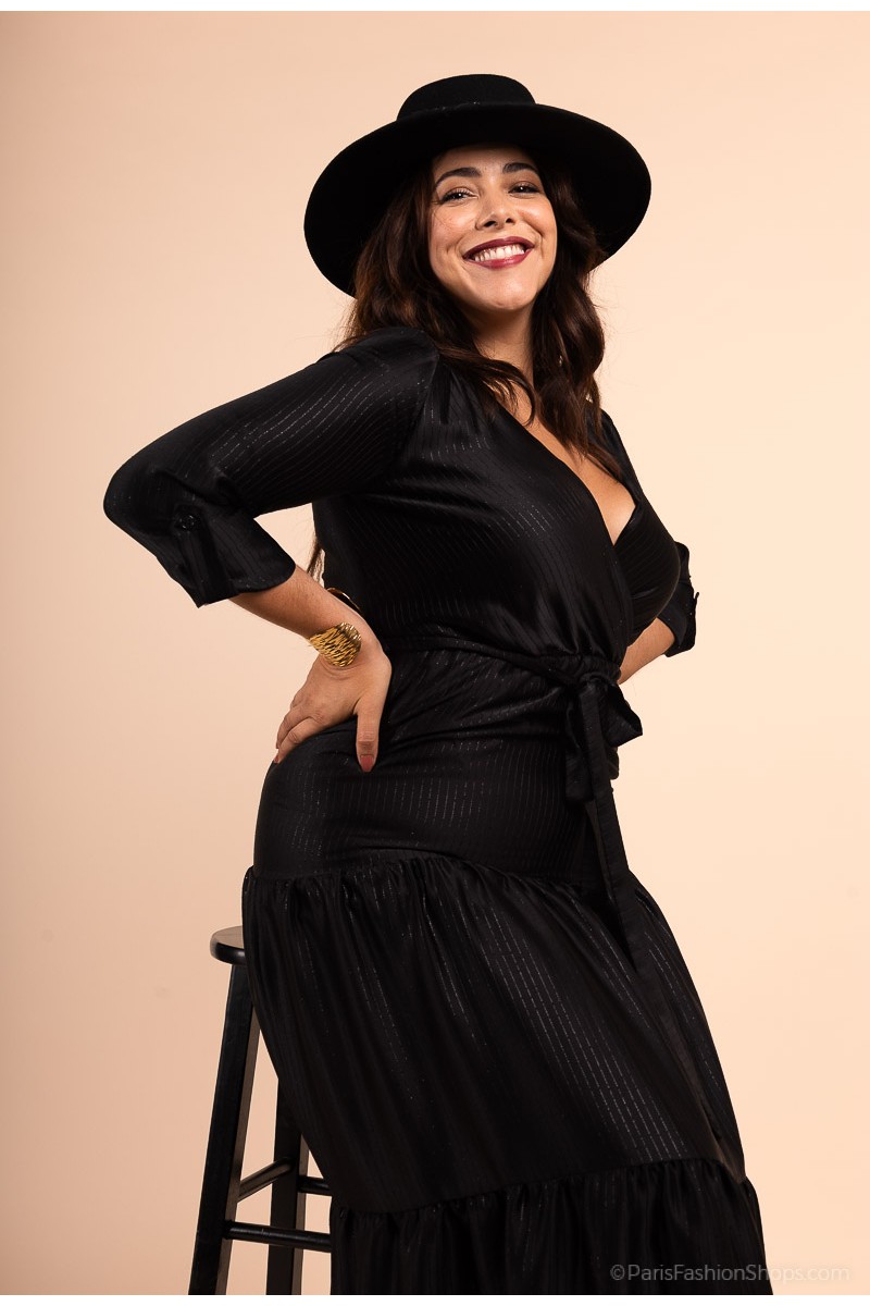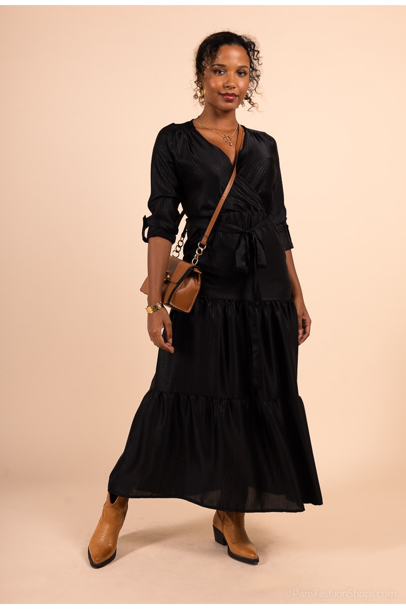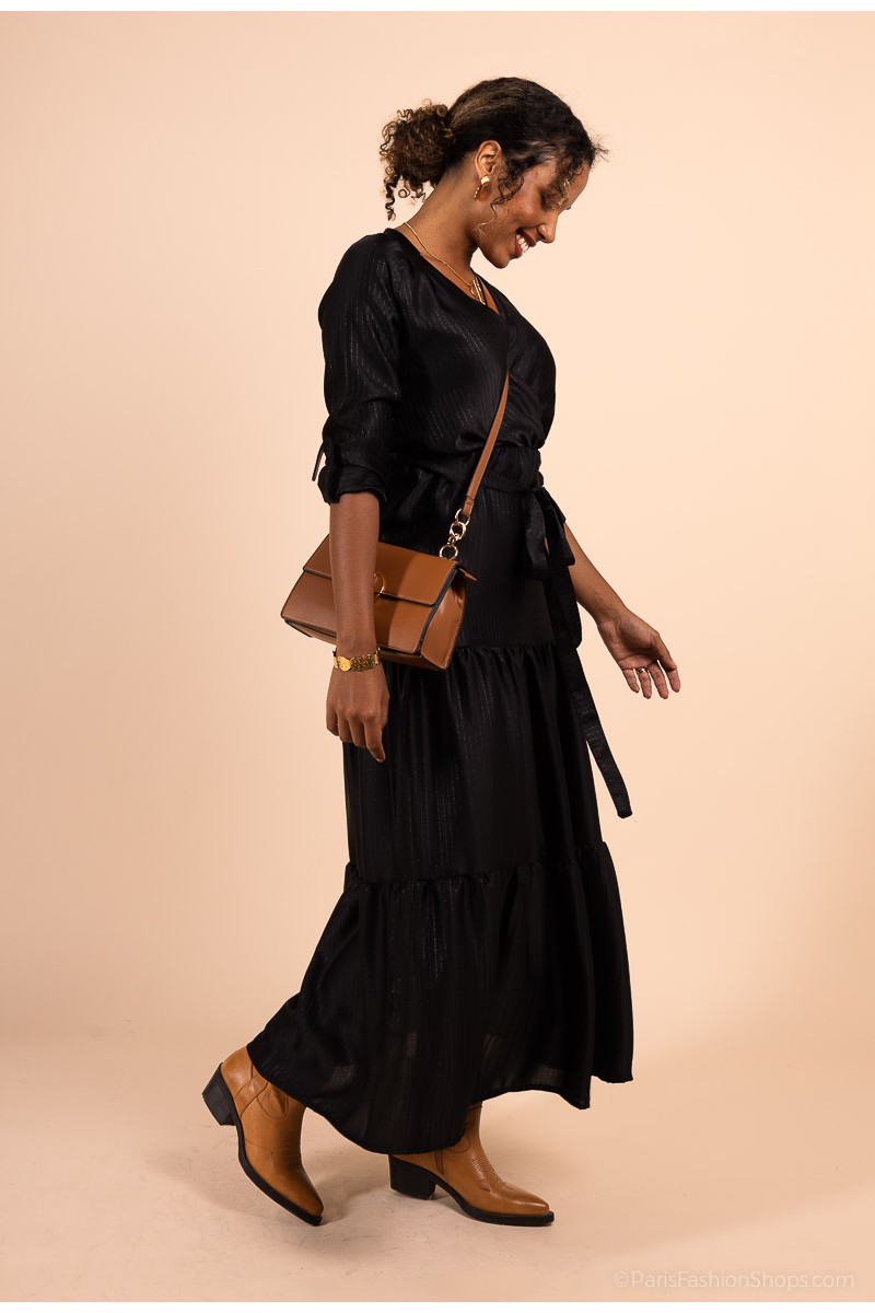 Cette robe est une robe moderne, tendance et qui saura vous mettre en valeur durant toutes les occasions où vous l’arborerez. Sa matière fluide et satinée est souligné par des détails en bandes fines discrètement brillantes. Robe longue et froncée, vous trouverez des doublures pour la jupe et à l’avant du haut. Quant au dos, il sera délicatement dévoilé par le tissu légèrement transparent. Pour sublimer votre silhouette plus qu’elle ne l’est déjà, vous trouverez une ceinture pour accentuée votre taille. Si vous souhaitez mettre en avant un accessoire autour de vos poignées ou tout simplement retrousser vos manches, vous pourrez le faire grâce aux manches longues qui pourrons être remonté élégamment avec une attache et un bouton.