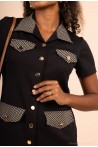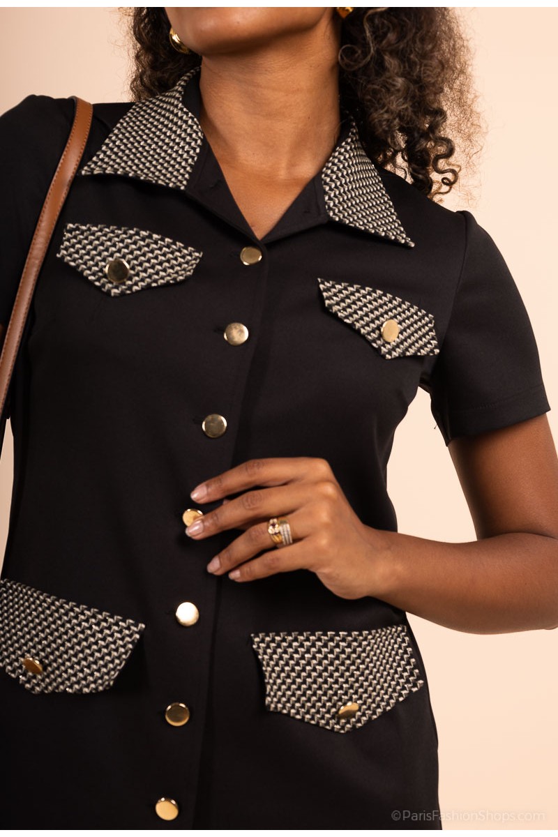 Découvrez notre robe mi-longue noir, une pièce incontournable pour toute garde-robe sophistiquée. Cette robe élégante est conçue avec un col en tweed raffiné qui ajoute une touche de classicisme à la silhouette moderne. Les rabats en tweed, au niveau des hanches et de la poitrine, apportent une texture contrastante, créant un look à la fois chic et intemporel. La robe est complétée par des boutons pour la fermeture, ajoutant une finition fonctionnelle et esthétique. Associez la avec des accessoires et une belle paire de chaussure pour que cette robe mi-longue noire soit la définition même de l'élégance versatile.