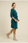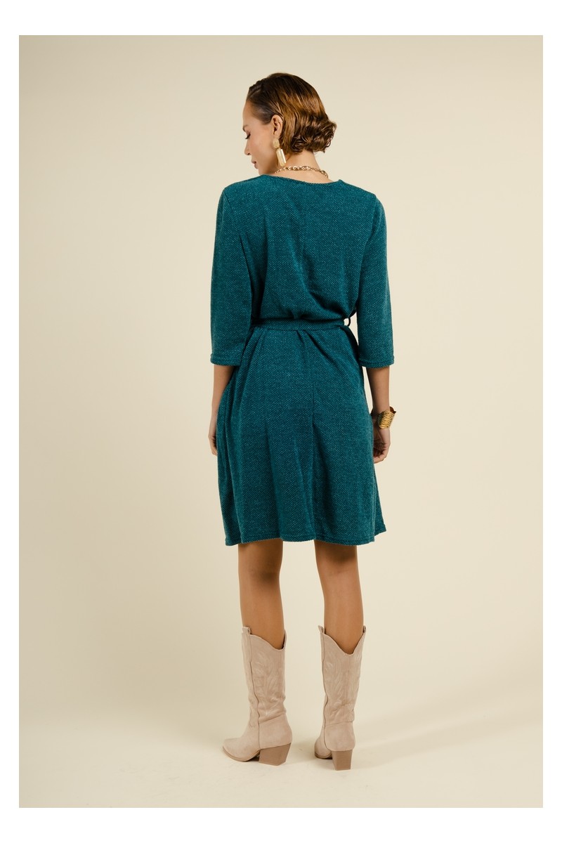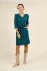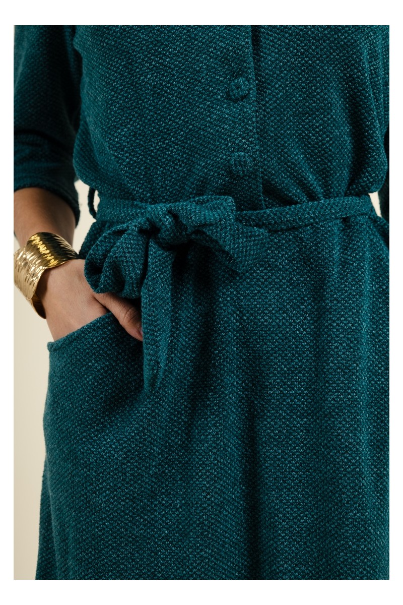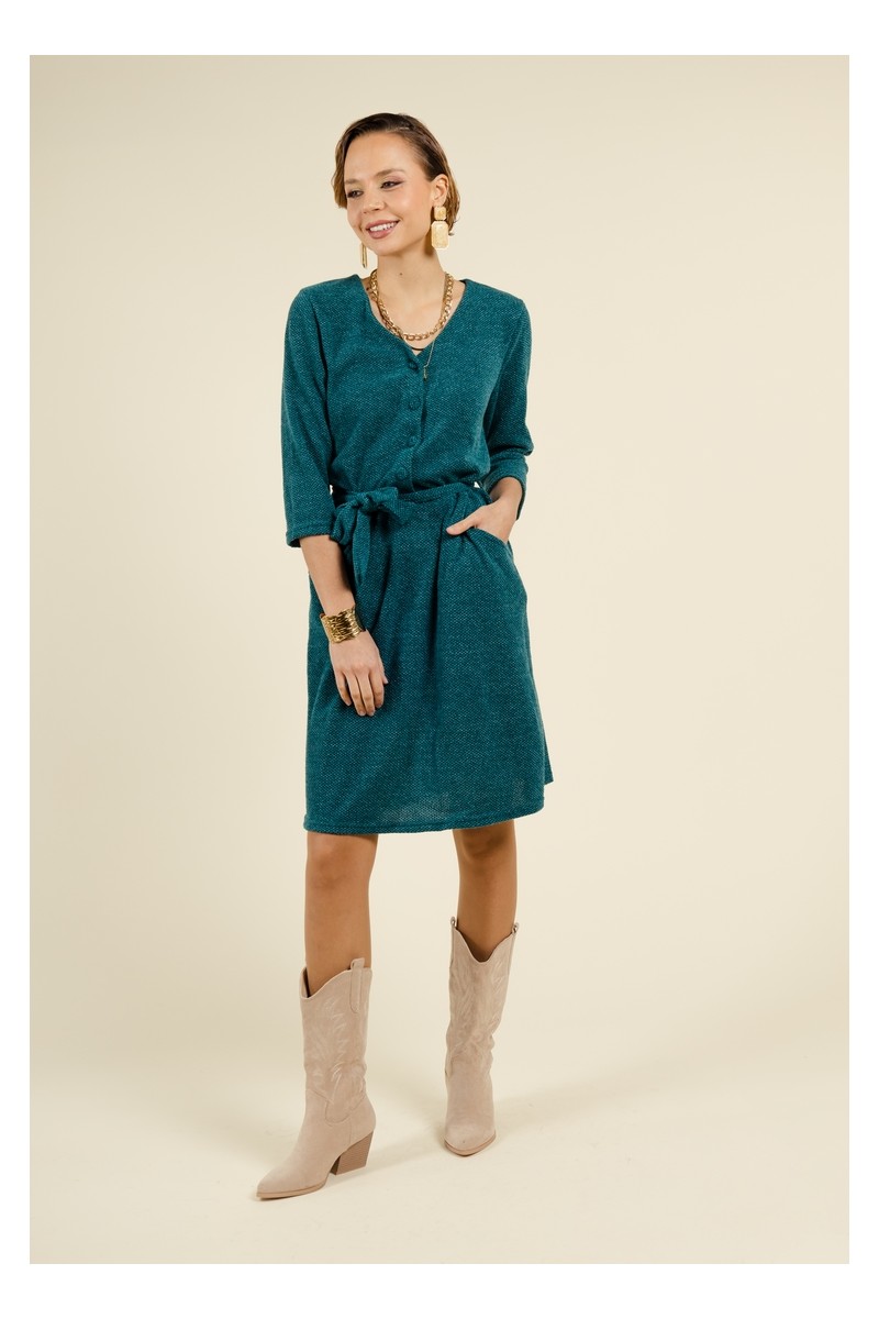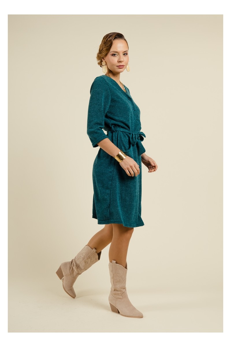 Découvrez notre robe droite vert canard au style moderne et élégant, conçue pour sublimer votre silhouette. Cette pièce est dotée d'un laçage pour ceinturer la taille, offrant une coupe flatteuse tout en mettant en valeur votre forme. Son encolure en V, accompagnée de petits boutons recouverts, ajoute une touche de sophistication à la partie haute de la robe. Avec ses manches 3/4 et sa longueur genou, cette robe est parfaite pour toutes les occasions. Pratique, elle est équipée de poches latérales discrètes pour un confort optimal.