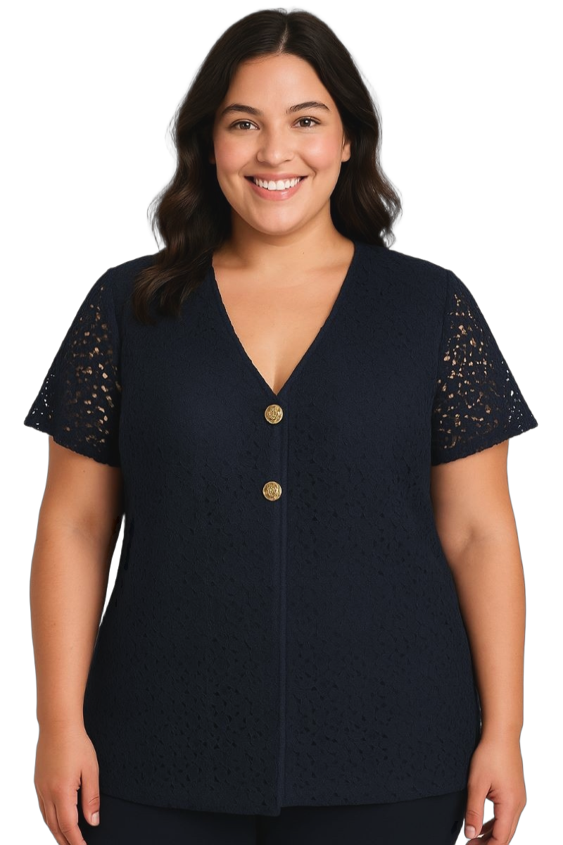 Craquez pour ce haut en dentelle bleu marine, une pièce sophistiquée qui combine charme classique et modernité. Il se distingue par son col en V profond qui met en valeur la poitrine et ses boutons dorés qui apportent une touche chic à l’ensemble.
