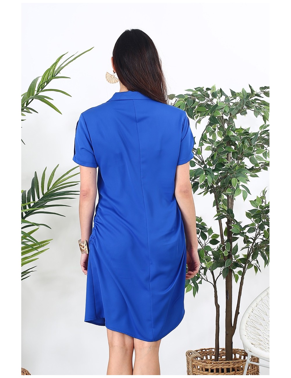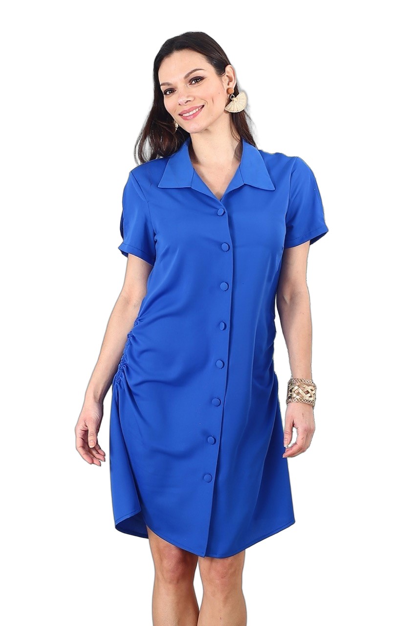 La fermeture boutonnée sur le devant apporte une touche classique et facilite l’enfilage. Des fronces discrètes sur les côtés créent un effet drapé qui valorise la silhouette avec subtilité. Sa teinte bleue éclatante donne un coup d’éclat à n’importe quelle tenue, idéale pour les journées ensoleillées ou une sortie estivale.