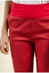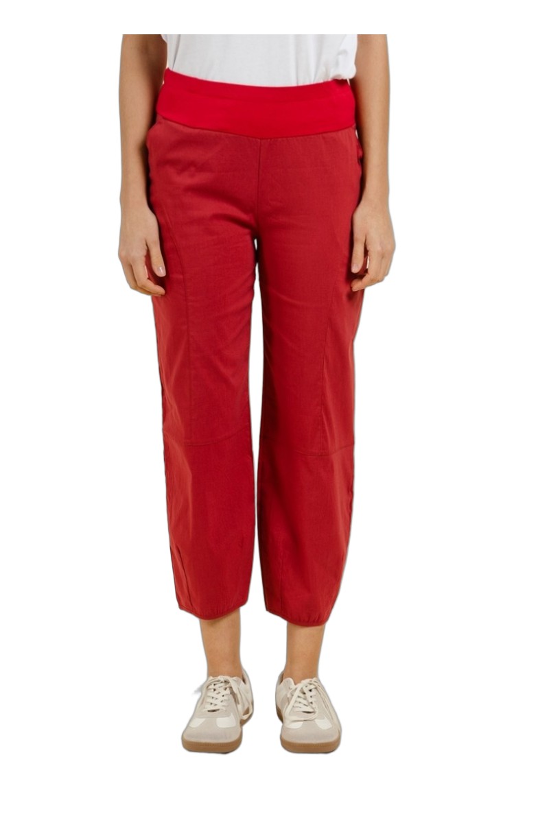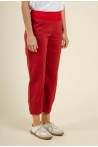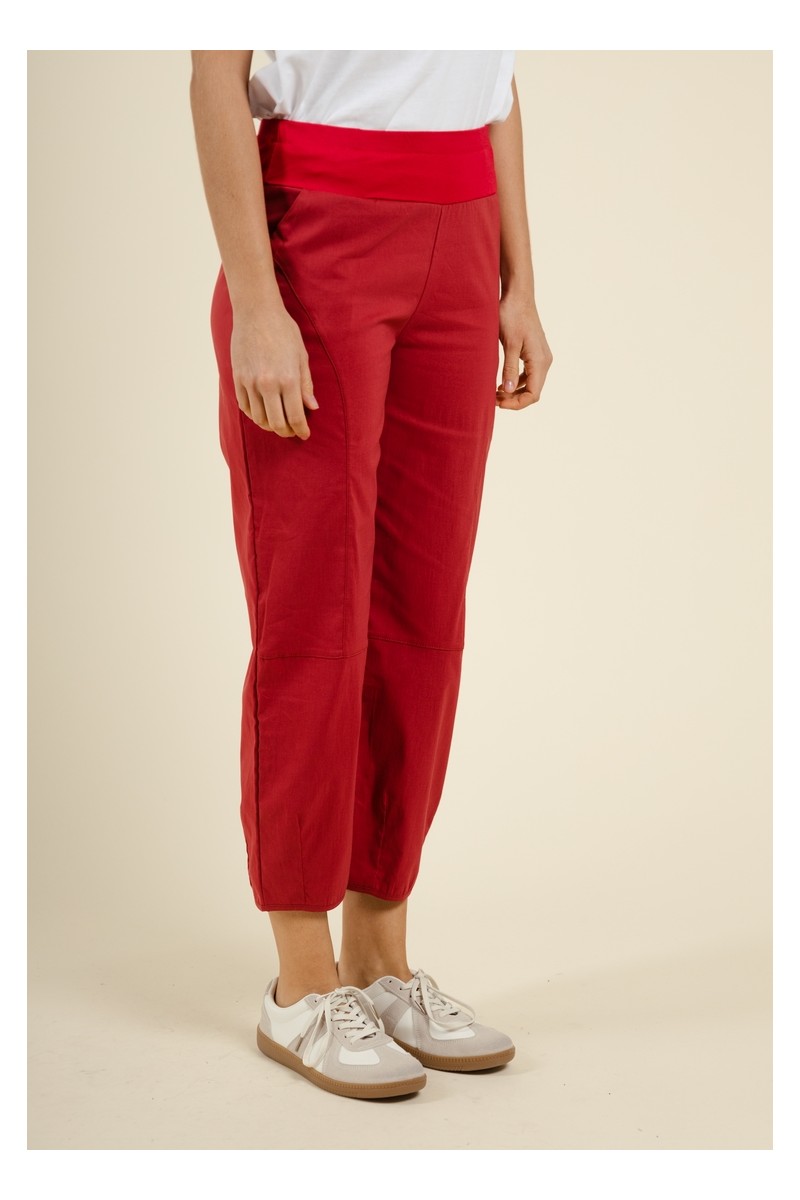 Ce pantalon en coton rouge allie confort et style décontracté. Sa taille haute élastiquée avec une large ceinture apporte un excellent maintien tout en douceur, idéale pour un porté quotidien. Conçu dans une matière souple et respirante, il offre une grande liberté de mouvement. La coupe légèrement ample et la longueur 7/8 donnent une allure moderne et estivale.
