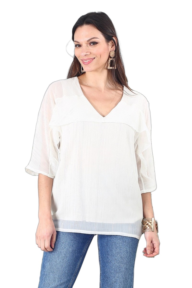 Blouse élégante en tissu fluide, idéale pour un look féminin et décontracté. Elle se distingue par son col V délicat qui met en valeur le port de tête, et ses manches 3/4 confortables, parfaites pour la mi-saison. Le détail raffiné des volants sur le buste, subtilement doublés, apporte une touche de romantisme et de légèreté à l’ensemble. Cette pièce au tombé naturel offre une silhouette fluide et flatteuse, facile à associer avec un pantalon clair ou une jupe pour un style chic au quotidien.