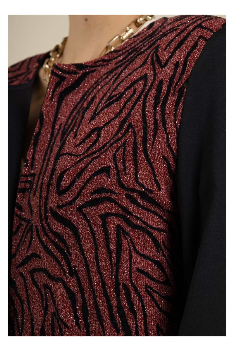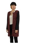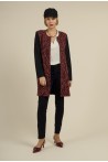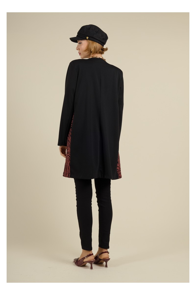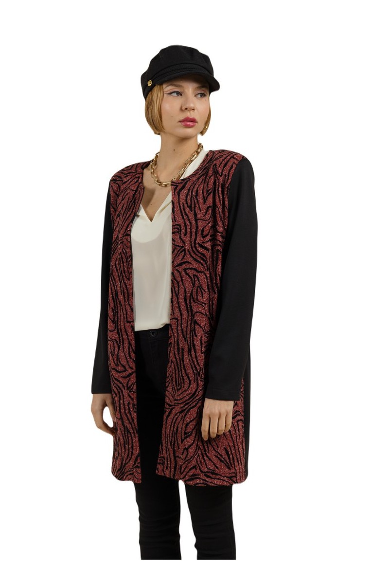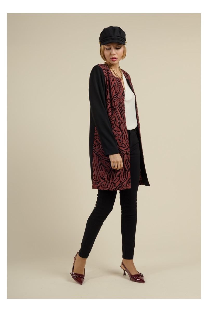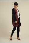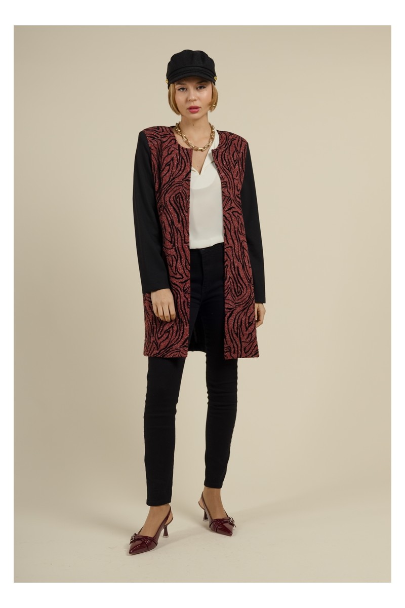 Apportez une touche de chic à votre garde-robe avec la veste YOMOLO Bordeaux de la collection MULTIPLES. Cette veste ouverte à la coupe élégante et moderne arrive à la hauteur du genou, offrant une silhouette raffinée et intemporelle. L'imprimé sophistiqué sur le devant contraste avec un dos uni noir, créant un look à la fois audacieux et élégant. Parfaite pour toutes les occasions, elle combine confort et style, idéale pour rehausser vos tenues quotidiennes