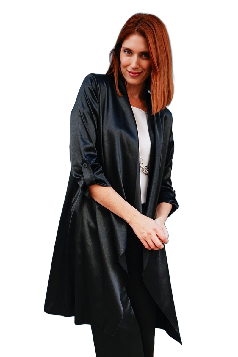 Adoptez un style élégant et fluide avec cette veste longue noire en satin, entièrement fabriquée en France. Sa coupe ouverte légèrement évasée apporte du mouvement et sublime toutes les silhouettes.